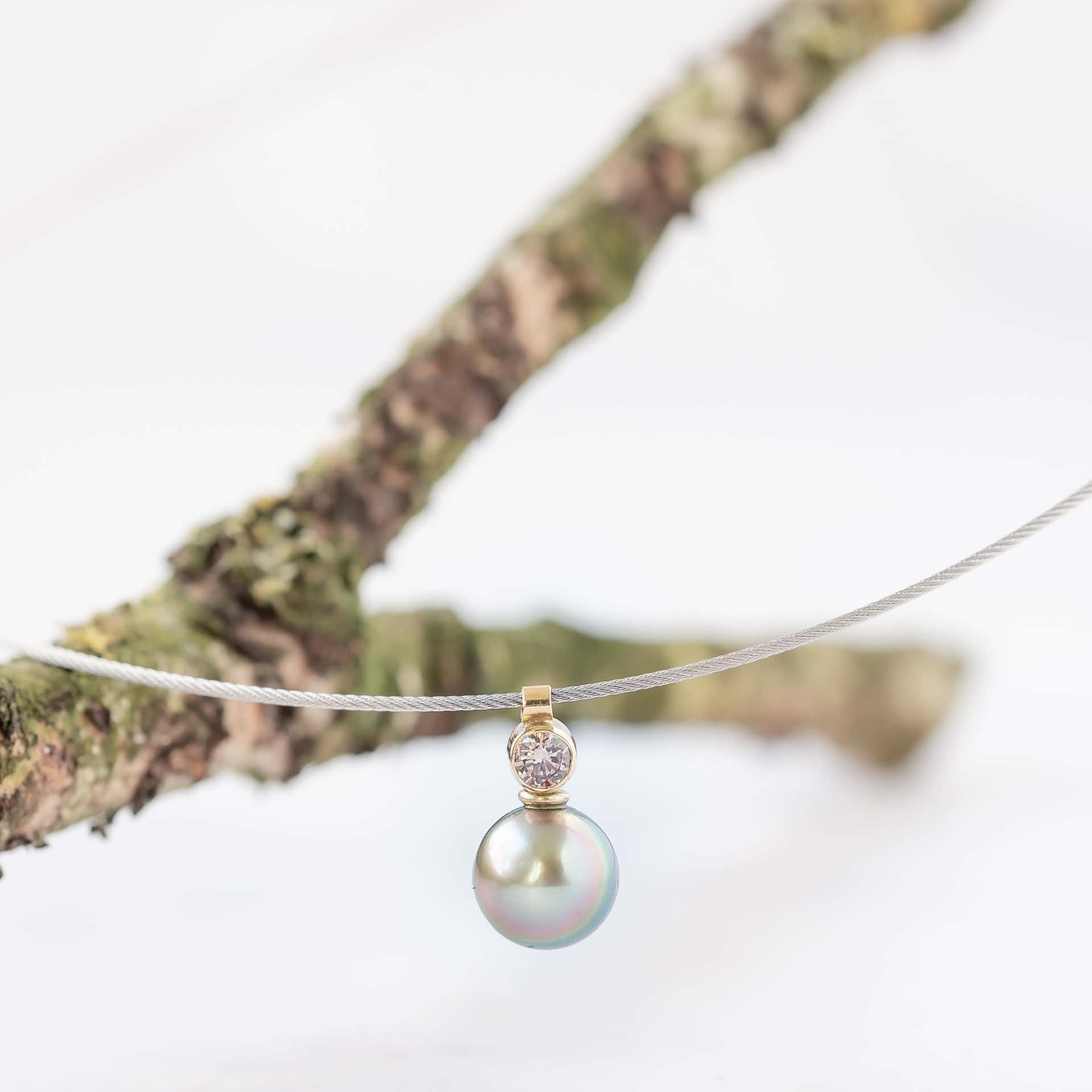 Gouden hanger met Tahiti parel en briljant geslepen diamant, sterling zilver collier.
