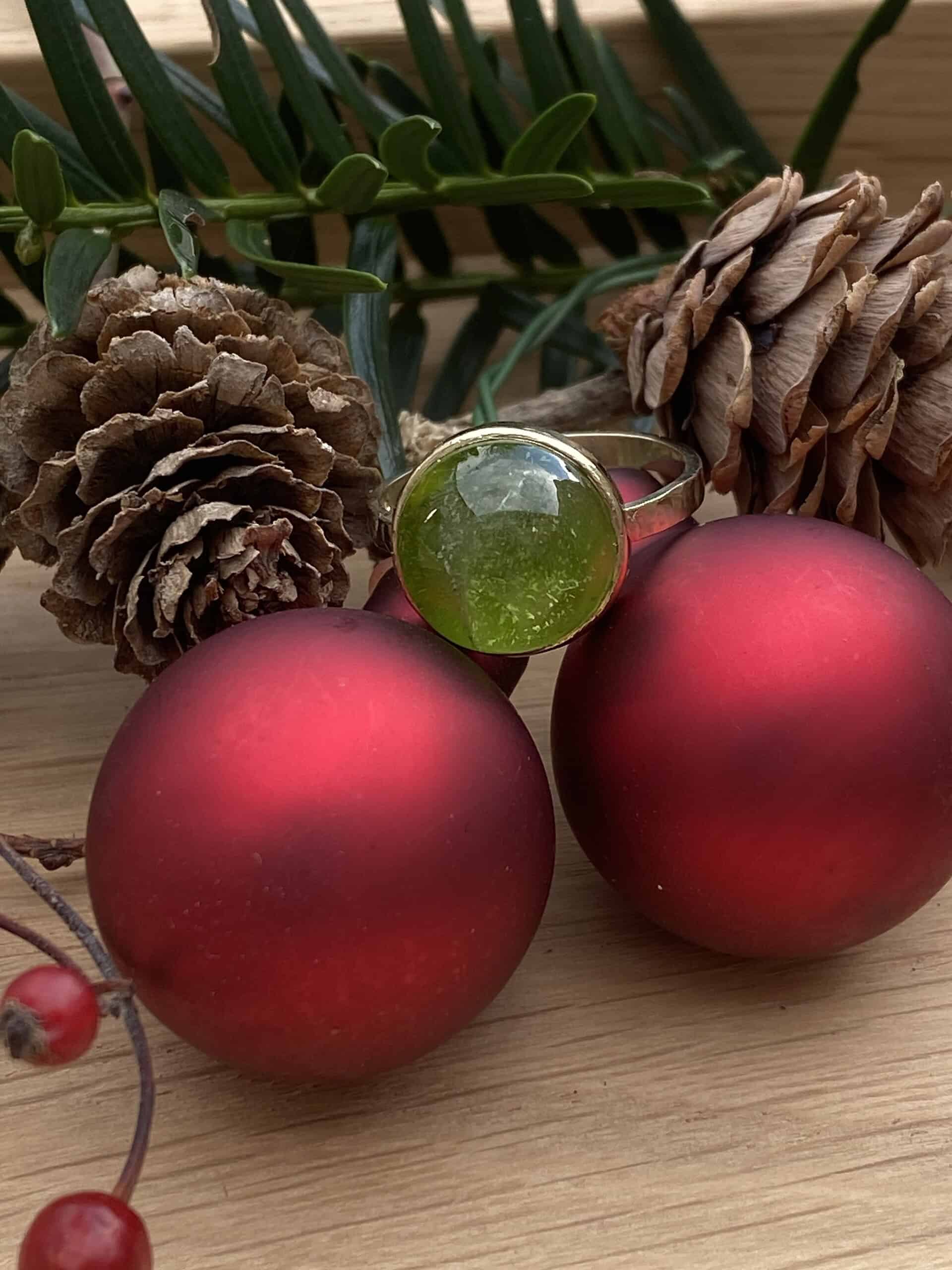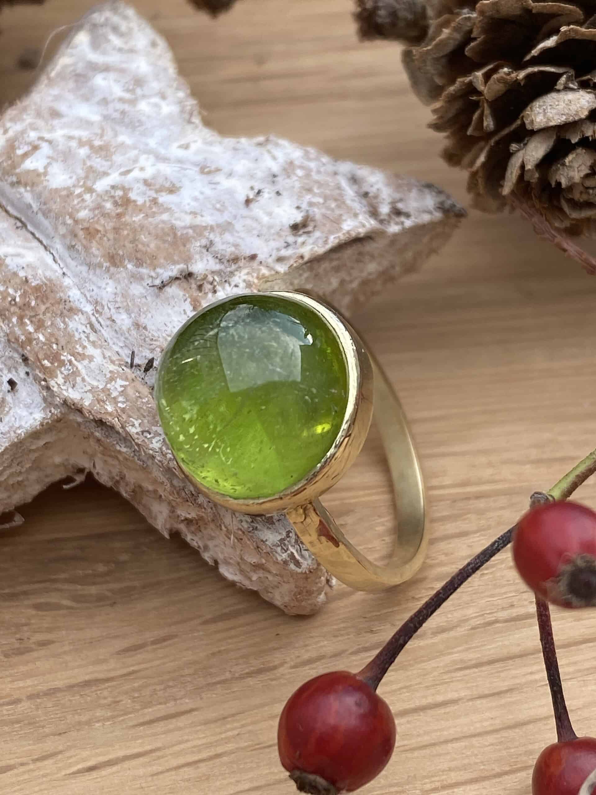 Gouden ring, gehamerd, met prachtige groene peridoot cabochon. Deze kleur geeft een statement van kracht en vreugde. De peridoot staat voor groei, welzijn en bescherming.