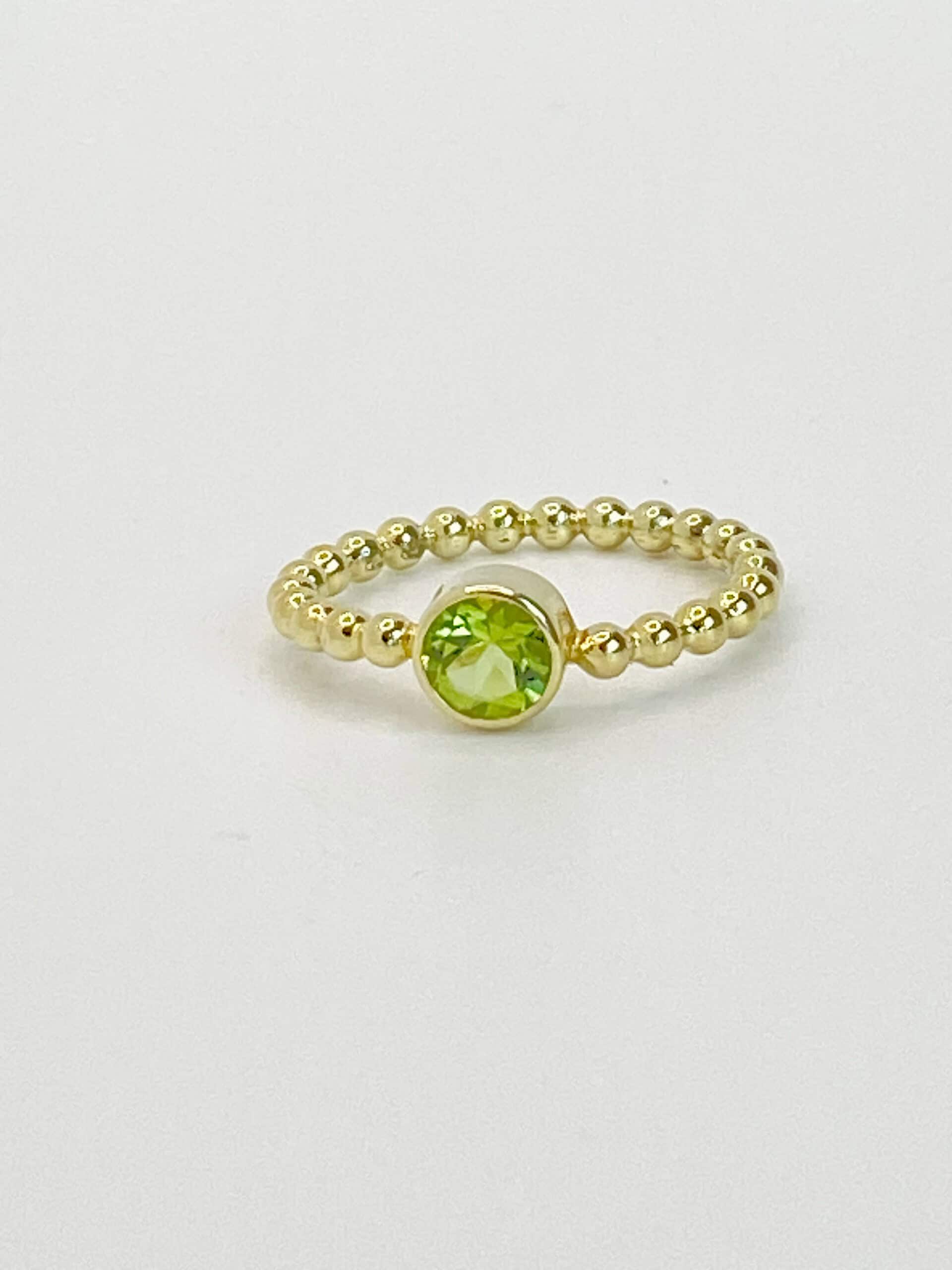 Gouden ring van pareldraad met peridoot, facet geslepen.