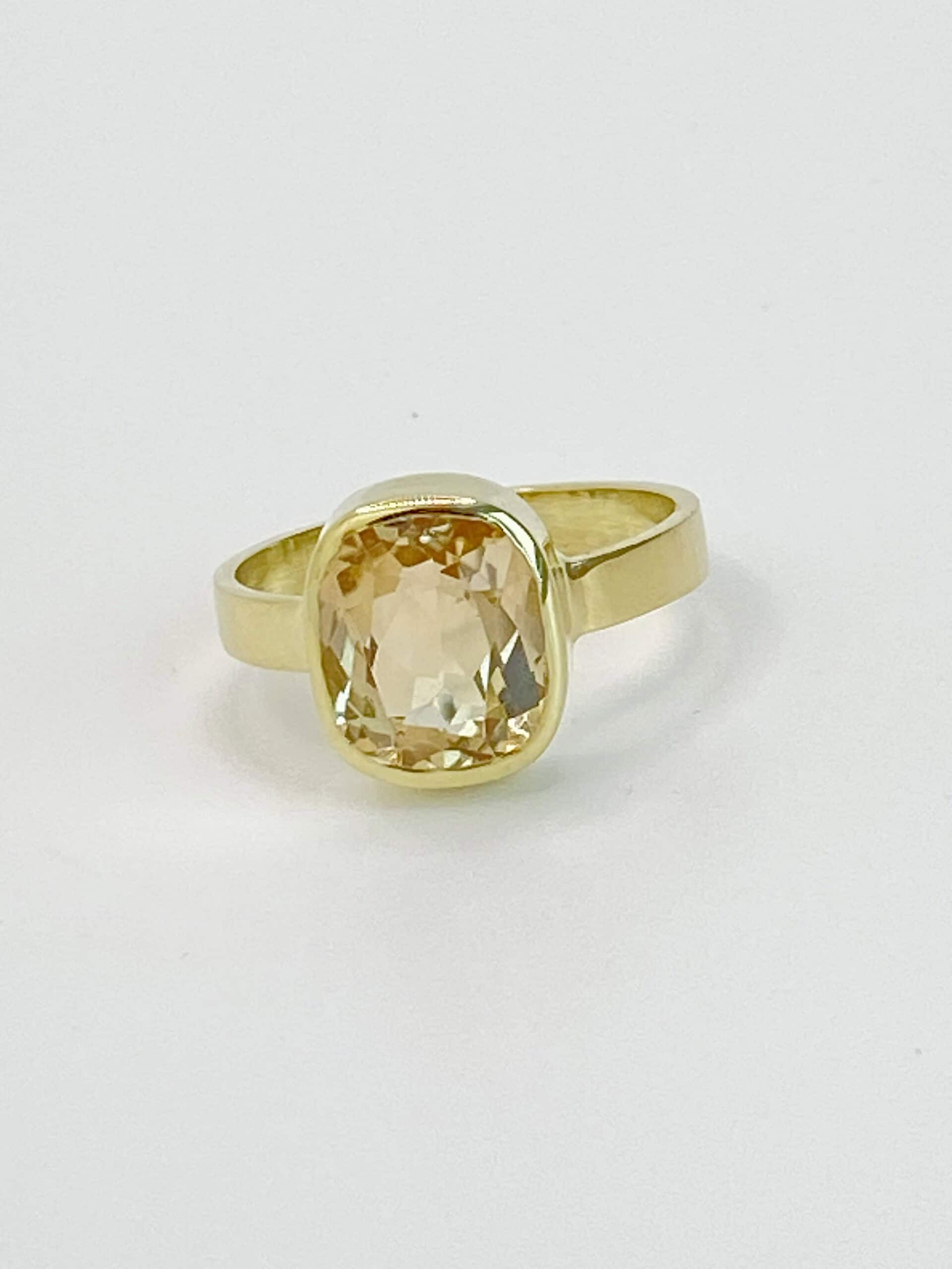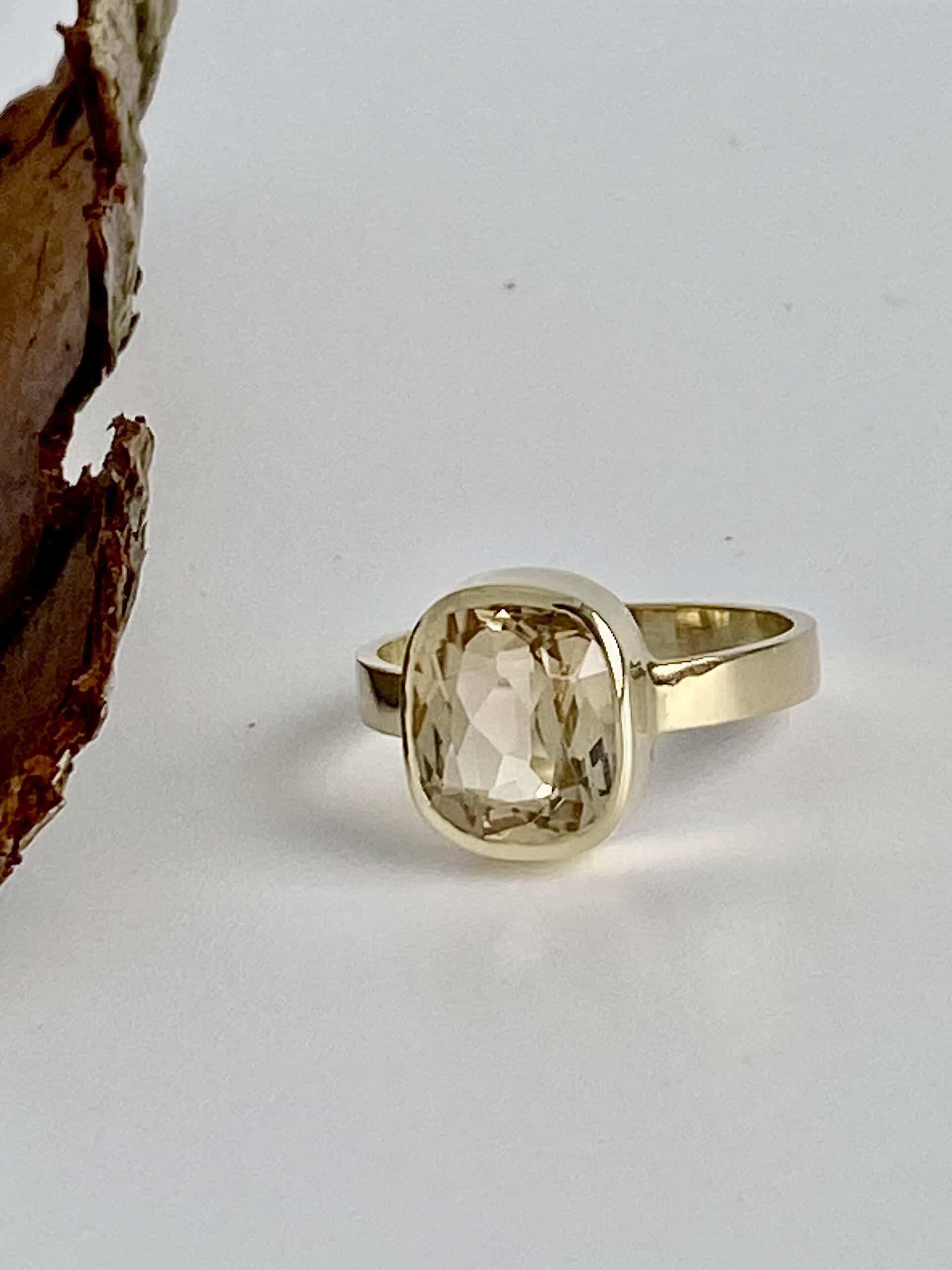 Gouden ring met gele toermalijn. De edelsteen is antiek facet geslepen en heeft een briljante glans.